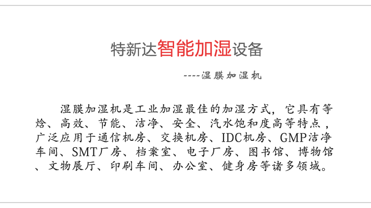 采用进口湿膜,亲水性好,对水质要求低,单位体积加湿量大,抗菌防腐、经久耐用(可选有机膜、无机膜及金属膜) 标配多重防水保护,使用无忧,机房专用加湿机采用前开门多方位维护方式,使维护更便捷,节约维护成本